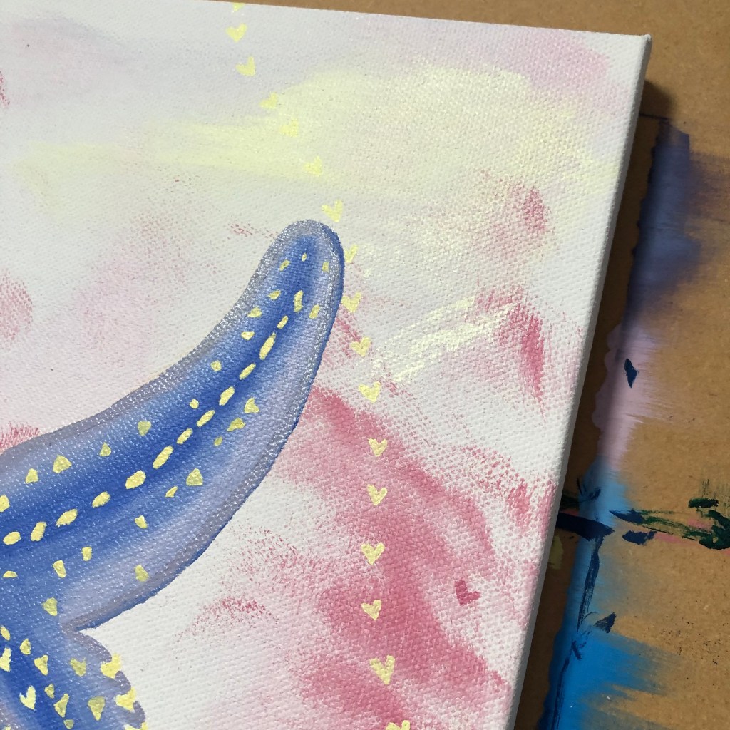 The heart strings were already there, and I wanted the sea star to look bold and colourful. In the end I painted my star friend in oil, and added in more hearts so he looks like he’s wrapped in them.